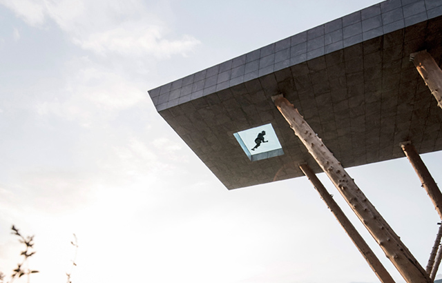 Projektovana da ide 17 metara ispred ulaza u hotel, ova pravougaona konstrukcija je podignuta 12 metara iznad tla i podupreta deblima domaćeg ariša kome je odstranjena kora.