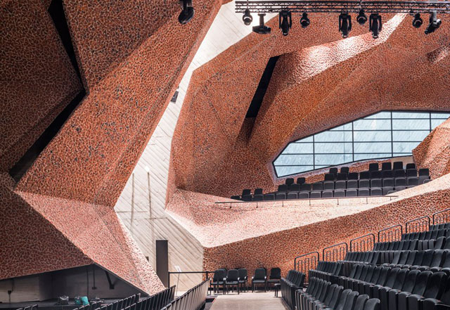 Lomljena crvena cigla i beton su zajedno kombinovani kako bi stvorili unutrašnjost nalik pećini za „CKK“ koncertnu dvoranu u Jordanu. Na taj način je stvoren prostor koji daje optimalnu akustiku i pogodan je za muzičke nastupe. Projekat je delo arhitekte sa Tenerifa, Fernando Menisa.