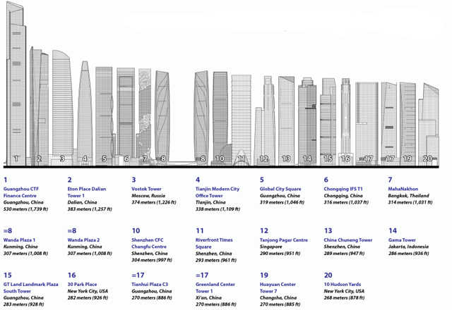 „To je u kombinaciji sa još uvek „hladnom“ nacionalnom ekonomijom, izazvalo neke pretpostavke da je doba „gradnje bez presedana“ u opadanju. Međutim to može biti slučaj kada se posmatra duži period jer su kratkoročni izgledi i dalje visoki - 328 zgrada u rasponu od 200 metara i više je trenutno u izgradnji u zemlji."
