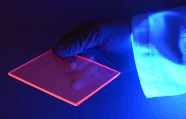 Slika. Svetlost koncentrisana po ivicama na silicijum baziranom LSC nije vidljiva golim okom već uz pomoć UV svetlosti (foto: Uwe Kortshagen, University of Minnesota; preuzeto sa www.sciencedaily.com)