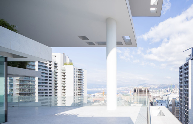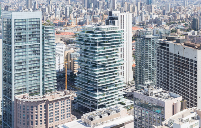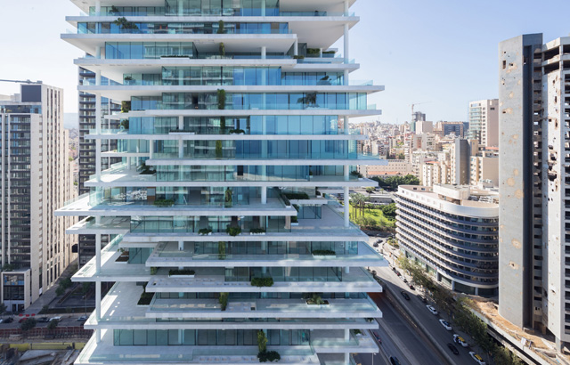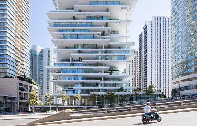 Naizmenično raspoređene i zastakljene spratne ploče su postavljene kako bi stvorile velike terase u okviru ove 119 metara visoke kule. Ova kula koja gleda na marinu u Bejrutu je projekat švajcarskih arhitekata Herzoga i de Meurona.