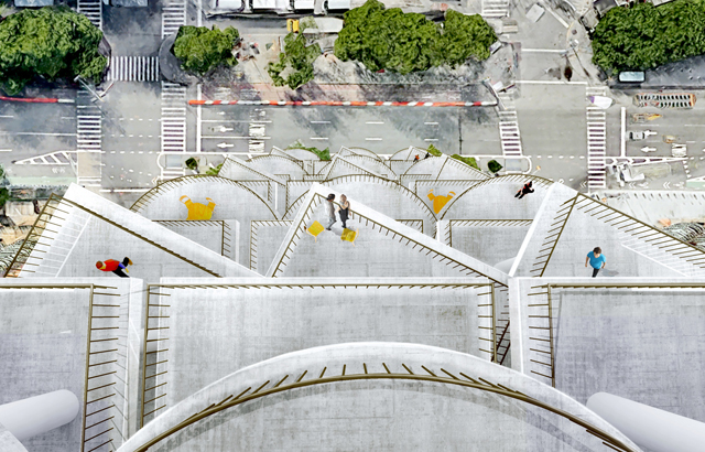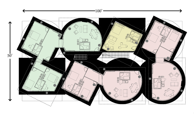 Korišćenje tri različita oblika stola, koji su namerno asimetrično složeni, stvaraju otvore u ploči između stambenih jedinica. Rezultat je vertikalni dvorišni prostor koji predstavlja zonu slobodnog kretanja koja donosi svetlo i vazduh. Prostorna kompozicija u okviru „Table Top Apartments“ generiše novi način života u okviru pristupačnije stambene izgradnje.