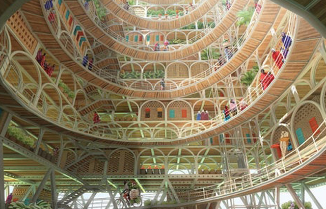 „Konstrukcija je napravljena s jednostavnim modularnim elementima, što olakšava izgradnju, dekonstrukciju i transport", kaže se u projektu. „Moduli postavljeni jedan na drugi stvaraju objekat koji ide u visinu i zauzima najmanji mogući prostor od lokalnih poljoprivrednika."
