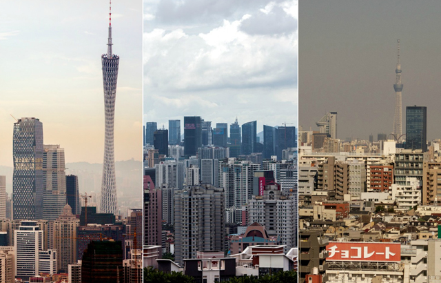 Kao i Šendžen, tako je i Guangzdžou još jedan „Pearl River Delta“ grad koji je doživio veliki arhitektonski razvoj usled rasta proizvodnje i ekonomije. Mnogi od njegovih novijih nebodera su grupisani u centru grada oko „Canton Tower“, gde se nalaze veliki trg i park. Veći deo ostatka grada je u stilu tradicionalne socijalističke arhitekture, gde stambene zgrade ispranih pastelnih boja ocrtavaju liniju ulica.