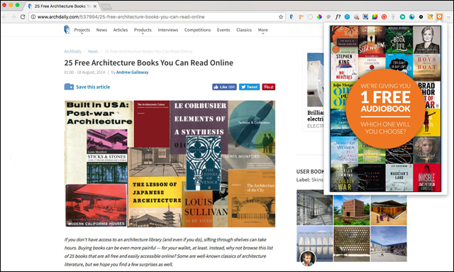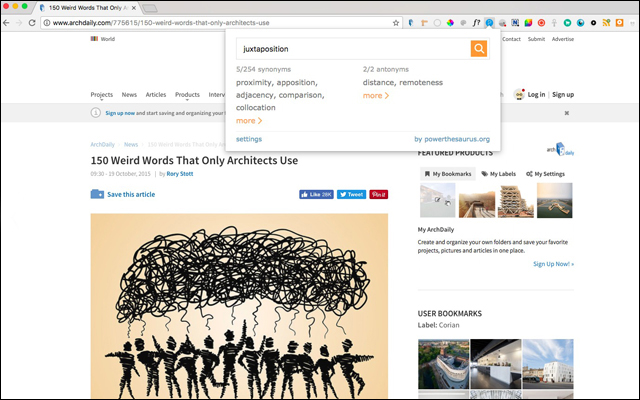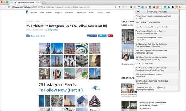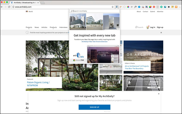 ArchDaily ima svoj Google Chrome dodatak koji optimizuje pretragu preko široke baze koju poseduje – tu se nalaze mnogi arhitektonski i građevinski projekti, dela, informacije o arhitektama, materijalima i sl.