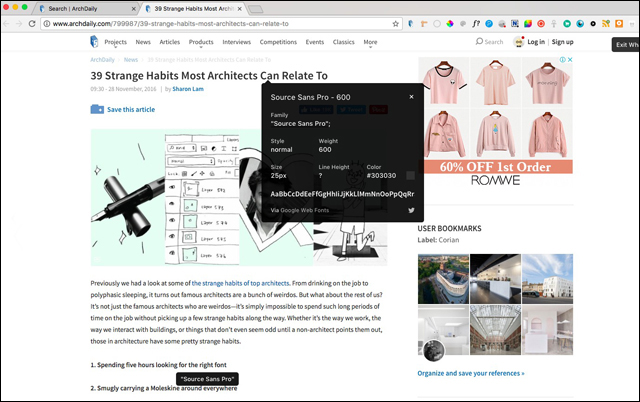 Mnoge arhitekte menjaju svoj omiljeni font s promenom godišnjeg doba. Imajući to u vidu, WhatFont Chrome će prepoznati font i njegovu veličinu za tekst na bilo kojoj web stranici, dajući portfoliju, web stranici ili prezentaciji osvežavajuću nadogradnju.