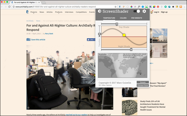 Arhitekte ponekad mogu raditi dugo u noć, pogotovo kada se približavaju rokovi. Kada se dan čini kratkim, odsjaj na ekranu računara može dodatno da oteža stvari. Dodatak Screen Shader može barem dati predah očima. Potrebno je samo voditi računa da se ne koristi prilikom renderovanja, jer osetljive boje u ovom modu mogu biti izmenjene.