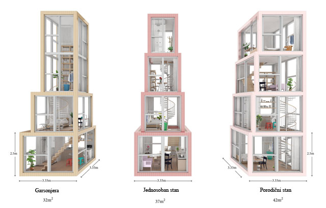 Ovaj projekat primenjuje modularni sistem gradnje koji koristi „lagane“ materijale. Ovde su nagomilane stambene jedinice raspoređene tako da se nalaze jedna na drugoj.