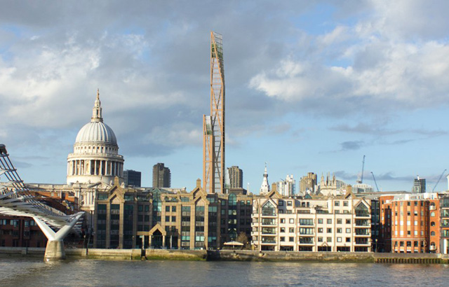 Ne daleko iza nje je 9-spratna „Stadthaus“ zgrada u opštini Hekni u Londonu, koja predstavlja prvi gusto naseljeni stambeni blok od unakrsno laminiranih panela. Ovi paneli su poznati pod nazivom „CLT“ i izrađeni su od slojeva drveta koji su spojeni i mnogo su jači od običnog drveta.