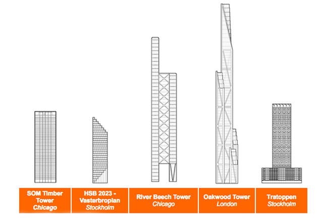 Primeri uključuju 300-metara visoku kulu „Oakwood Tower“ u Londonu, koja bi ukoliko bude bila završena, bila druga najviša zgrada u gradu, zatim kula u Čikagu koju je projektovala firma SOM i „Traptoppen“ u Stokholmu, za koji je planirano da ima drvene panele.