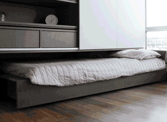 Ovaj komad nameštaja u punoj visini može se pomerati napred i nazad kako bi se oslobodio prostor sa obe strane. Po potrebi, krevet se uvlači ispod u spremište, a ispod TV-a se pojavljuje komoda.
