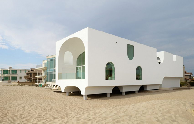Johnston Marklee izrezao je lukove u fasadi ove kalifornijske kuće na plaži kako bi dobio pogled na more. Oblik se prenosi kroz unutrašnjost, stvarajući niz svodnih vrata, soba i hodnika.
