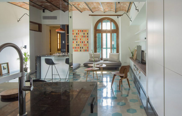 Firma Nook Architects je zadržala originalni katalonski zakrivljeni tavan sa malim lukovima, lučna balkonska vrata i heksagonalne pločice kada je renovirala ovaj stan u Barseloni. Ogledala su pomogla da prostor deluje veći nego što jeste.
