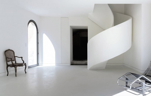 Kroz lučna vrata se proteže svetlost u prijemnu prostoriju sa zakrivljenim belim betonskim stepeništem u ovoj renoviranoj francuskoj farmerskoj kući, povezujući stari deo zgrade sa novim fasetnim proširenjem. Projekat je delo pariskog studija Dixneufcentquatrevingtsix.