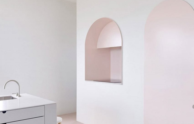 Nežna paleta boja od bledo ružičaste do bele naglašavaju lučna udubljenja u prostoru kuhinje koji je mladi studio BoardGrove Architects ugradio u ovaj stan u Melburnu.