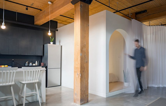 „Kutija“ napravljena po porudžbini služi kao nekonvencionalni prostor za spavanje u ovom stanu u Torontu. Nalazi se u neposrednoj blizini prostorije za garderobu i karakterišu je lučna vrata i bele zavese kojim se obezbeđuje privatnost.
