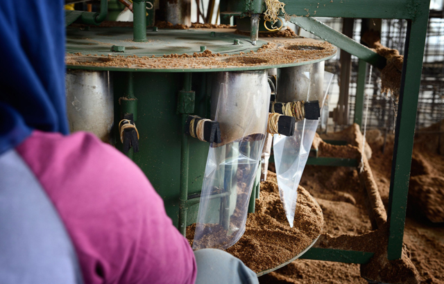 Da bi se napravili blokovi, spore gljiva se kombinuju sa hranljivom mešavinom koja uključuje piljevinu i šećernu trsku. Gljive troše hranljive materije, tako da nakon nekoliko dana ovo počinje da se pretvara u gustu i sunđerastu masu. Zatim se prebacuje u kalupe, gde nastavlja da se zgušnjava.