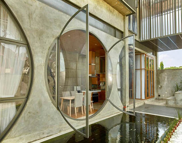 Kuću indonežanskog arhitekte Realricha Sjariefa karakterišu veliki kružni i polukružni prozori koji povezuju dom i radni prostor sa dvorišnim vrtom. Jedan od njih uključuje dvokrilna vrata koja se otvaraju preko bazena.