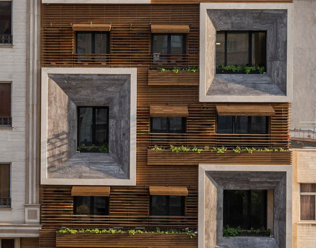Ovaj stambeni blok od drvene konstrukcije svoje ime preuzeo je iz tradicionalnog krilnog prozora izrađenog od rešetkastog drveta i vitraža, koji je projektovan sa ciljem da smanji uticaj sunčeve svetlosti i intenzivne toplote. Lokalni studio Keivani Architects unapredio je dizajn dodajući fasete okvirima.