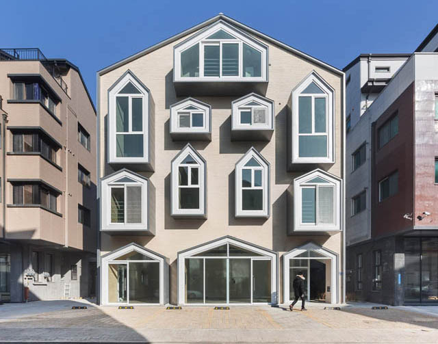 Jedna od ekscentričnih zgrada na ovoj listi je stambeni blok u Južnoj Koreji koji je projektovao AND studio. Prozori u obliku kućica vire iz fasade, a njihovi kosi profili se nastavljaju unutar zgrade.