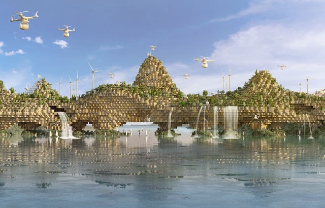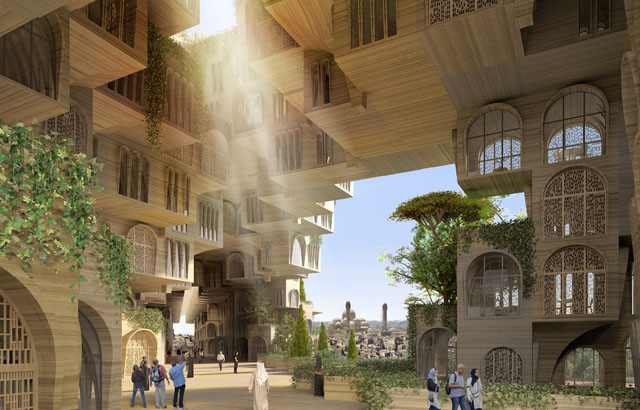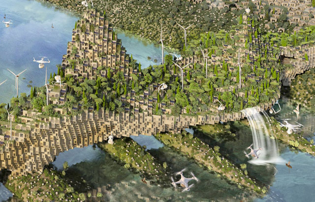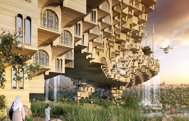 Dronovi bi tada radili zajedno sa 3D robotima štampačima poput paukova na izgradnji. Dronovi bi snabdevali robote paukove odgovarajućim materijalom za izgradnju preko 50.000 modularnih kuća na vrhu mostova. Ove kuće će biti složene u obliku saća inspirisane islamskim mukarnasama (vrsta svoda). Mostovi će biti pokriveni urbanim farmama i drugim zelenilom, i garantovali bi hranu stanovnicima grada ali i poboljšali toplotne performanse mostova.