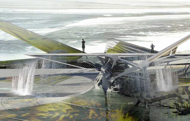 „Iskopano zemljište biva gurnuto u stranu, a veštačko ostrvo koje okružuje kuću tada deluje kao nadstrešnica koja „gura“ vodu daleko od kuće", kaže Krasojević. „Solarni paneli postavljeni su duž podnih ploča ostrva i okruženi prstenom turbina. Dizajn nalik rotirajućoj ploči sastoji se od šezdeset i četiri odvojene sekcije drvenih delova koji deluju kao polje za odvodnjavanje koje usmerava kišu i odvodnu vodu daleko od kuće. Ovi delovi su bliži kući kako bi pomogli u efikasnom odvodnjavanju i ponašaju se kao propeleri za vodu."