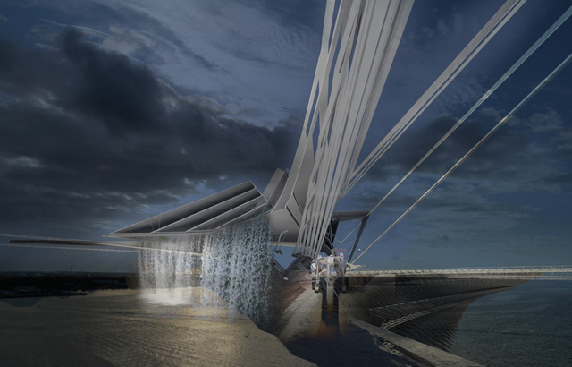 Osnovna ideja je da, kako vetrovi dobijaju na jačini tj. brzini, oni time obezbeđuju dovoljno sile za pomeranje kuće, koja je u formi jedra, i duž helikoidnog potpornog zida zajedno sa hidrauličnim pivotima omogućavaju da se ona uroni u zemlju kako bi smanjila svoj obim i zaštitila se od vetra. Kuća bi bila „zatvorena“ od strane veštačkog ostrva projektovanog da ispusti vodu od poplave.