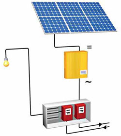 Istosmerna struja teče iz solarnih modula (plavo) u izmenjivač (žuto) koji je onda pretvara u izmjeničnu struju, a ona se preko brojčanika (crveno) skladišti u mrežu.