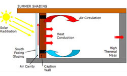 Zajedno sa ventilacionim sistemom ovaj kompletan sistem se ponaša kao veliko solarni kolektor.Tokom dana, sunce sija kroz zastakljenu površinu i zagreva masivni zid.