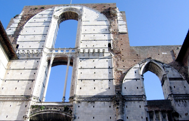 Prepoznatljiva konstrukcija italijanske gotske katedrale u Sijeni završena je 1348. godine, ali je ambiciozan projekat proširenja započeo 1339. godine i napušten nakon manje od deset godina rada kada je bubonska kuga pogodila grad 1348. godine. Izgradnja na projektu proširenja katedrale nikada nije nastavljena. Nekoliko nedovršenih spoljnih zidova planiranog proširenja i dalje stoje, a na delimično izgrađenom podnom delu sada se nalaze muzej i parking.