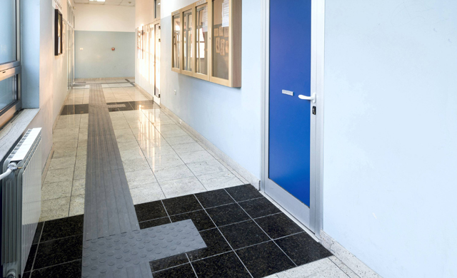 - reljefom taktilnih linija, to su staze VODILJE. Njihova svrha je da usmeravaju slepa i slabovida lica po pravcima kretanja u spoljašnjem prostoru od parking mesta za lica sa posebnim potrebama do ulaza u objekat i obratno.