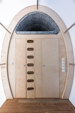 Drvene šindre na prednjoj strani obojene su sa narandžastim i plavim prugama i upućuju na tradicionalne kolibe na plaži, a forma podseća na ogroman dvogled koji je karakterističan za turistička mesta.
