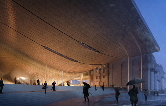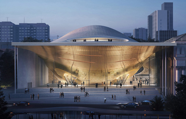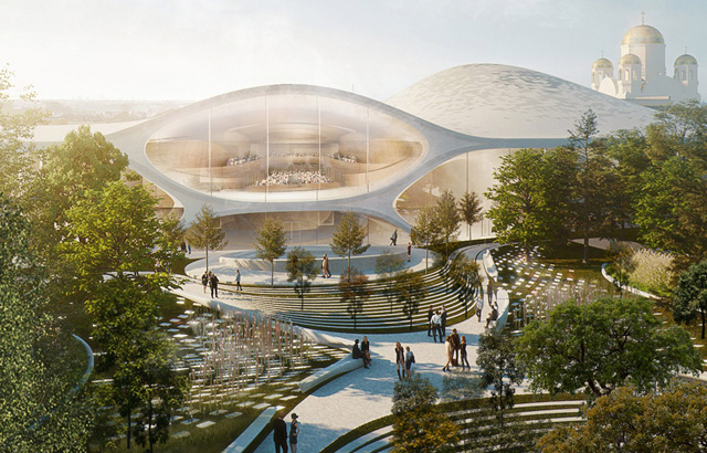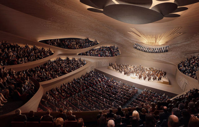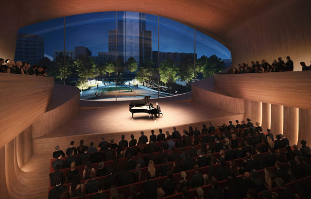 Dve koncertne dvorane nalaziće se ispod čelične krovne konstrukcije koja je inspiraciju za formu dobila u zvučnim talasima.
