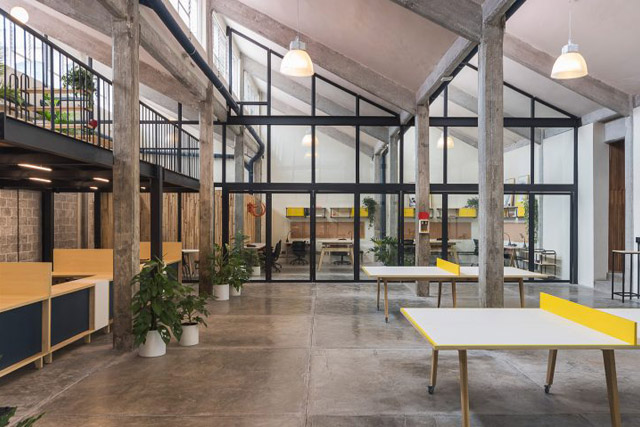 Stolovi za ping-pong sa svetlo-žutim pločama umesto mreže dodaju boju ovom industrijskom okruženju kooperativnog prostora u Meksiko Sitiju.