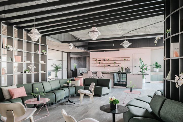 Kancelariju koja je ranije bila fabrika karakterišu betonski stubovi, zidovi od cigle i visoke staklene pregrade. Ta pregrada je zapravo konstrukcija koje se sastoji od crnih metalnih greda koje su iskorišćene da formiraju kutke za čitanje u okviru mezanina.