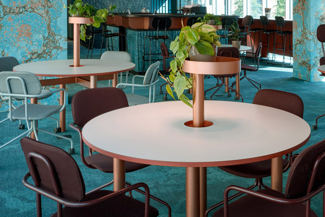 Firma Beza Projekt se odrekla tipičnih boja za kancelarisjki prostor i umesto toga pokrila noseće stubove ovog poslovnog prostora u Varšavi sa mermerno tirkiznim tapetama kako bi se stvorila atmosfera kao u klubovima.
