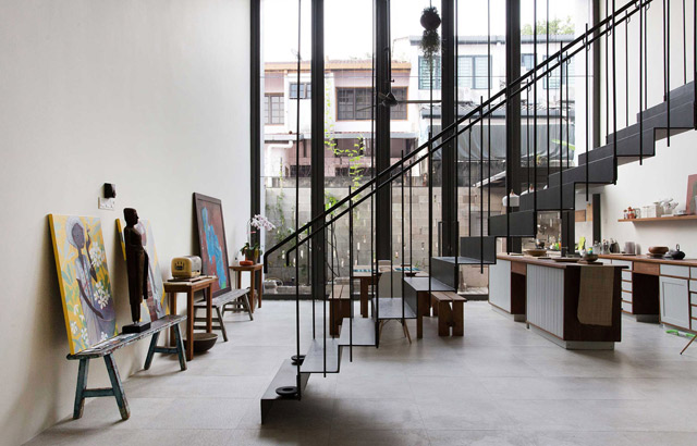 Kroz kuću prolazi delikatno čelično stepenište, pričvršćeno preko šipki, koje izgleda kao da visi sa gornjeg sprata gde se nalazi svetlarnik sa otvorima koji obezbeđuju ventilaciju.
