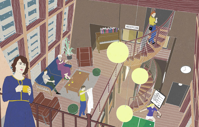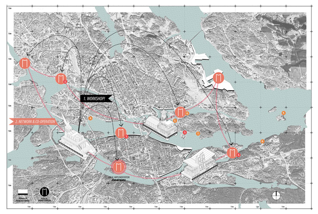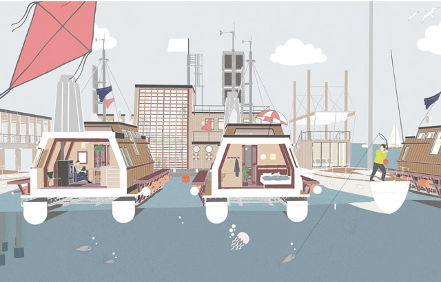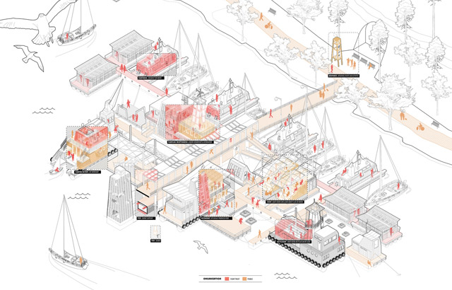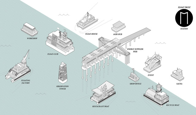 Zajednica bi bila povezana preko pristaništa, jedinog dela koji je spojen sa kontinentom. Preko ovoga bi takođe bila omogućena i veza između onih koji žive na kopnu i onih koji su na vodi. Sav nameštaj bi se gradio na licu mesta uz korišćenje plutajuće fabrike, dok bi sve tipologije zgrada bile mobilne. Plutajuća zajednica bi uključivala radionice na postojećim plovilima u cilju povezivanja postojećih zajednica na plutajućim objektima, udruženja brodova i budućih stanovnika brodova.