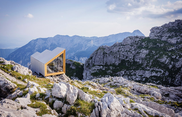 Smešteno na stenovitom izdanku podno planine Skuta, sklonište može da primi do osam planinara. Projekat je firme OFIS.