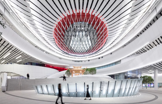 „Qi (što znači protok) je „izražen“ kroz kompleks sa krivudavim putevima i oblicima i lučnim ulazima projektovanim oko hipnotizirajućeg, višeslojnog kružnog atrijuma", kažu iz Revery Architecture. „Inovativna projektna odluka o kačenju prekrasnog „Grand Theatre“ koji obuhvata 1073 sedišta, da visi sa vrha zgrade „Xiqu Centre“ i to na visini od 27 metara, olakšava unutrašnju konfiguraciju atrijuma i javnog trga, dok strateški izoluje dvoranu od vibracija i visokog nivoa buke koja dolazi iz okoline. Ovaj inventivni dizajn je izuzetno koristan u omogućavanju sigurne izgradnje unutar i ispod pozorišta istovremeno, što je rezultiralo smanjenjem vremena izgradnje.