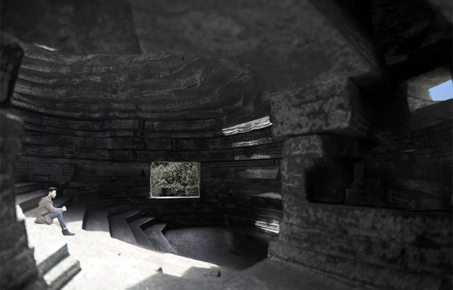 „Kada sija sunce, njegovi zraci plešu po grubim površinama pećine, ispunjavajući ga svetlošću i zvukom. Kada pada kiša, voda stvara sopstveno meditativno izvođenje padajući kroz centralni otvor hale i prskajući po podu pre nego što istekne kroz podne kanale“, kažu iz OPEN Architecture. „Kada nema zakazanog koncerta, dvorana je i tada destinacija za posećivanje ali je repertoar nešto drugačiji, tada se sluša pevanje ptica, cvrkutanje insekata, blagi povetarac koji šušti kroz obližnje drveće ili kišne kapi koje padaju na pod. Unutar ovog misterioznog prostora, priroda orkestrira stalno menjajuću simfoniju. To je kapela zvuka kako se u bukvalnom prevodu i naziva ovo mesto.“