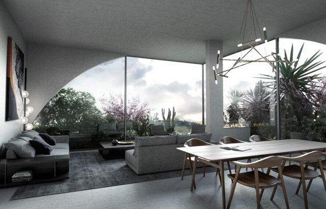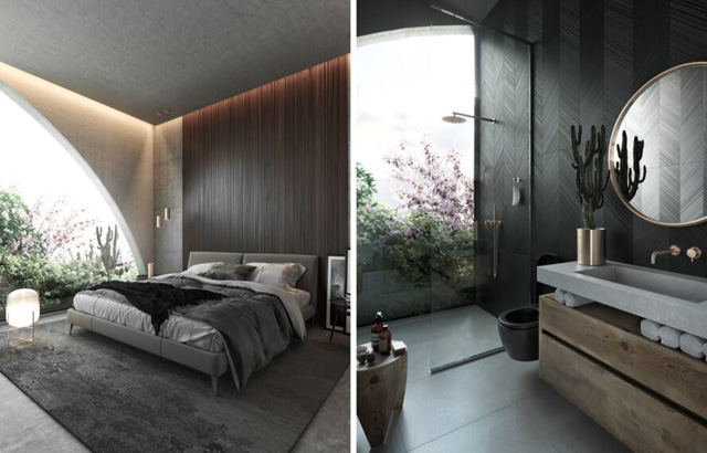 Enterijeri su zamišljeni sa minimalističkom i savremenom estetikom, gde čak i privatne prostorije, kao što su spavaća soba i kupatilo gledaju na vrtove i grad. Fokus je na otvorenom prostoru.