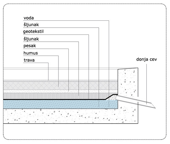Tokom faze betoniranja se dešava da se tradicionalni proces sušenja betona produžava, što uzrokuje da se voda zauvek zadrži u betonu. Voda je sama po sebi vodonepropusna natapajući beton do granice da se više ne može apsorbovati tečnost. Konstantnim punjenjem ploče vodom smanjuju se varijacije temperature u strukturnom delu, a to je ono što obično uzrokuje većinu pukotina koje mogu postati teške za kontrolisanje infiltracije. To jest, ploča ne dobija tačke kapilarnosti koje bi dovele do propusnosti. Deluje kao ogledalo od vode, na koje se dodaju slojevi za sađenje trave i ostalog vrtnog zelenila. Stalnim nivoom vode upravlja jednostavan ventil.