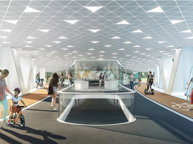 Shodno tome da je plan da premošćavala reku, u prizemlju bi se nalazile pešačka i biciklistička staza koje bi omogućile prelazak sa jedne na drugu stranu. Tržni centar bi se nalazio iznad, a dva piramidalna predvorja sa obe strane baze kružnog otvora služila bi kao glavne ulazne tačke za stambena i mešovita krila zgrade. Na vrhu bi se nalazila javna terasa.