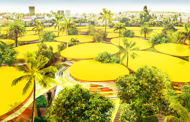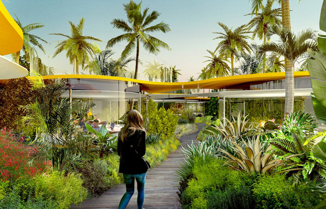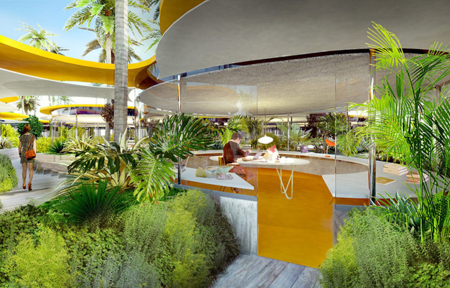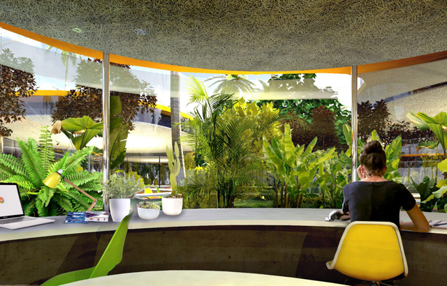 Kružni žuti krovovi nalaziće se na vrhu svakog ovog „prostora“, dok će zidovi biti napravljeni od prozirnog akrila kako bi se obezbedilo prirodno svetlo u što većoj meri kao i pogled na okolinu. Vijugavi putevi između ovih studija povezuju jedinice u cilju međusobne interakcije onih koji u njima rade. Šupljine između jedinica biće ispunjene biljkama i drvećem za koje se očekuje da će rasti iznad krovnih nadstrešnica. Ovde će se nalaziti 6500 biljaka i 400 stabala u svojoj punoj veličini.