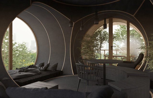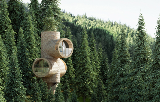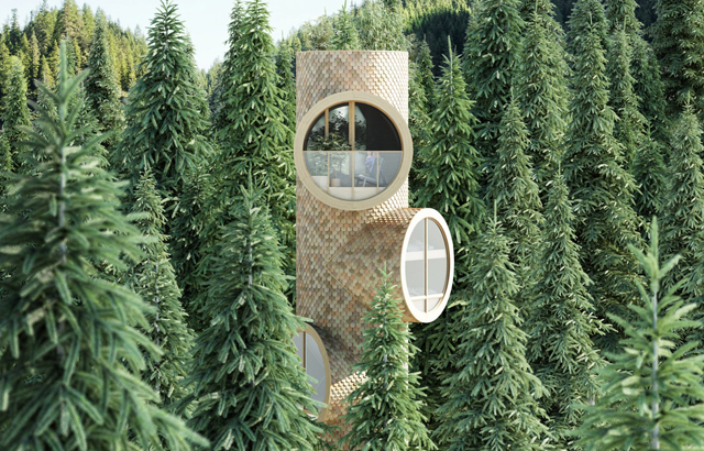 Kuća stoji na okrugloj osnovi i sastoji se iz modularnih delova u obliku cevi u okviru kojih se nalaze kuhinje, dnevni prostor, spavaće sobe i kupatila. Ovi moduli se mogu slagati preko i oko osnove, pa tako postavljeni podsećaju na kao grane koji se šire iz debla. Svi moduli i cela kuća bili bi od drveta sa šindrom nalik listovima kako bi se uklopili u šumsko okruženje. Veliki okrugli prozori i balkoni su postavljeni kako bi se mogao posmatrati krajolik, dok enterijer karakteriše tamna i prijatna atmosfera.