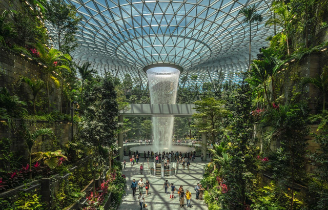 Aerodrom „Jewel Changi“ u Singapuru koji karakteriše najviši zatvoreni vodopad na svetu projektovala je firma Safdie Architects. Pored jedinstvenog vodopada, ovde se nalazi i park sa šetalištem i šumom, kao i objekat od stakla i čelika sa krovom u obliku krofne koji se prostire na preko 200m i ima rupu u sredini. U nju se sliva kišnica i kao rezultat nastaje vodopad koji se koristi da bi rashladio unutrašnjost ali se koristi i za navodnjavanje. Postavljena je i pumpa koja stvara isti efekat sa uskladištenom kišnicom kao i kada ne pada kiša.