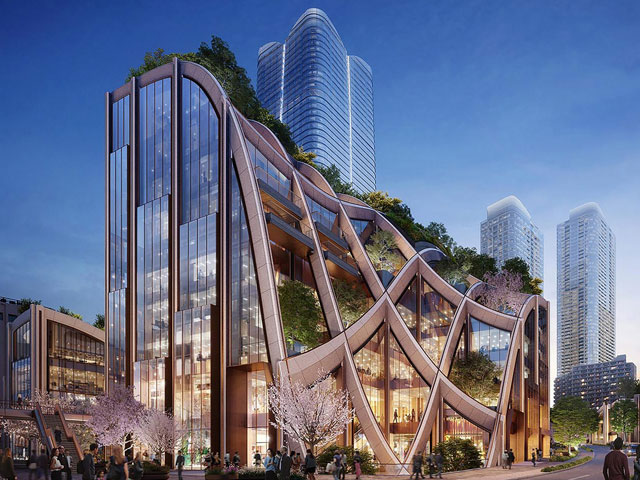 U okviru tri niskospratne zgrade u istočnom delu nalaziće se prodavnice, poslovno-stambeni prostor zajedno sa muzejom i galerijom, dok će niz prizemnih zgrada uz kule sadržati lobije za apartmane, hotelske sadržaje i prodavnice. Enterijer jedne od poslovnih kula sa komercijalnim sadržajima projektovaće Sou Fujimoto.