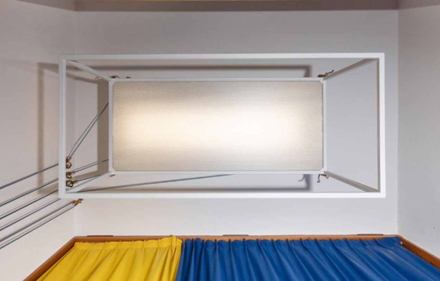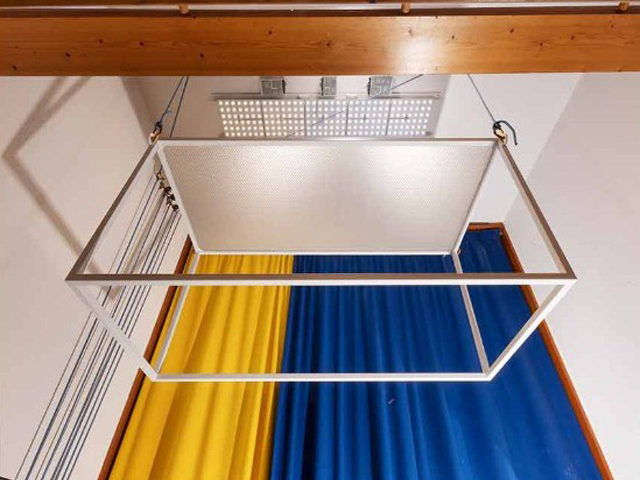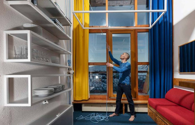 Arhitekte su osmislile interesantan način za uštedu i povećanje upotrebljivosti prostora - postavili su "leteći sto". Postavljen je beli trpezarijski sto sa sistemom remenica, koji se može podići prema plafonu kada se ne koristi. Ovo je moguće jer je plafon dvostruke visine.