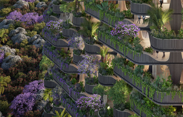 Shodno pasivnom bioklimatizmu i naprednim obnovljivim izvorima energije, odlučeno je da "Rainbow Tree" bude od drveta, jedinog prirodnog i obnovljivog materijala kojeg ima u izobilju .Zgrada će biti prekrivena sa više od 30.000 biljaka iz susednih tropskih šuma.